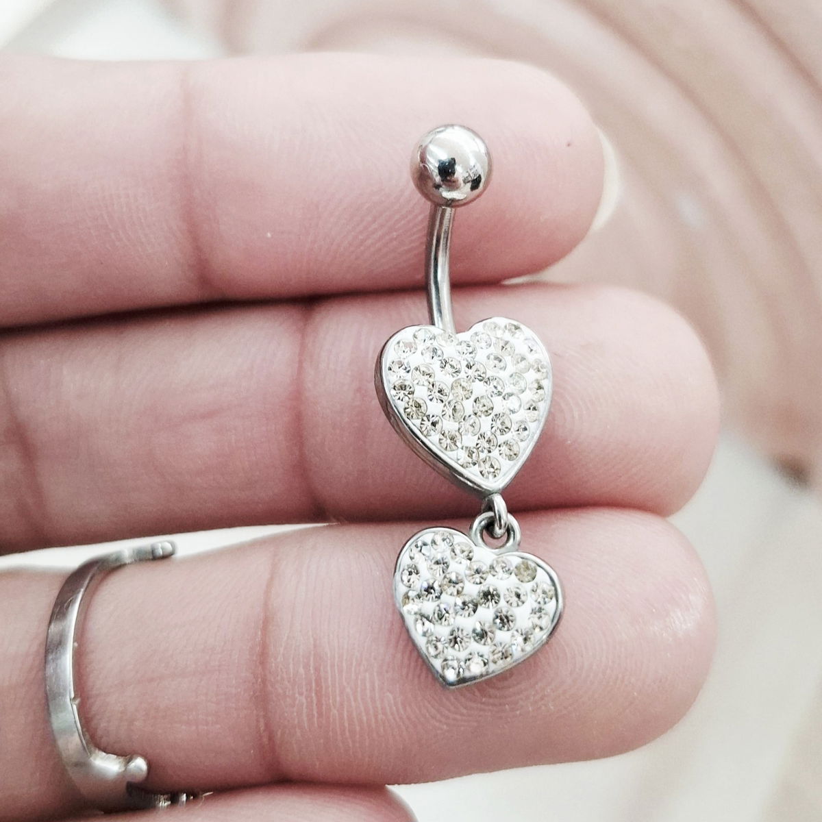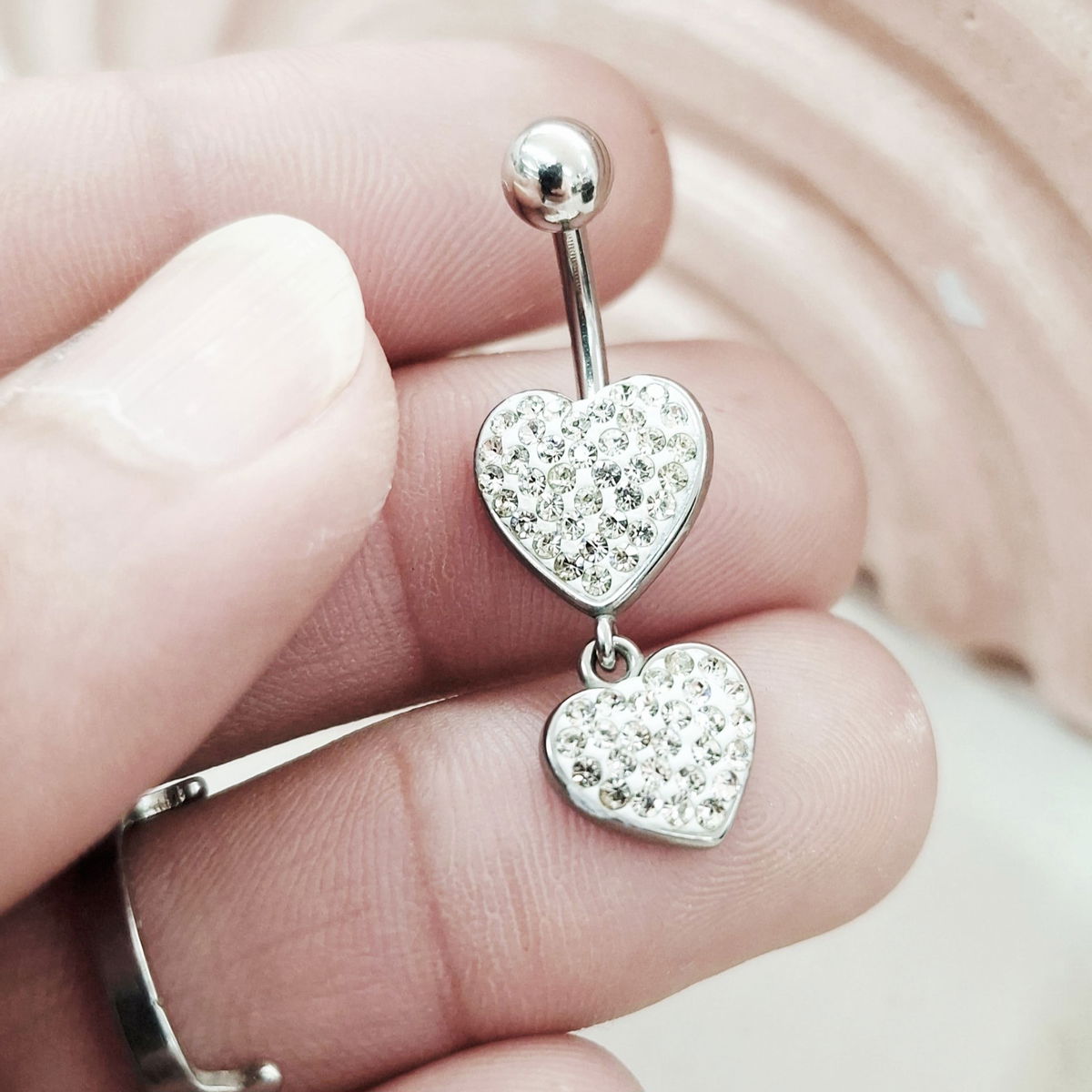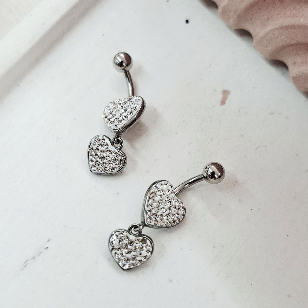 Piercing de ombligo con palito de 1.6mm de espesor, de Acero Quirúrgico. Con aplique de dos corazones con muuchos brillitos.